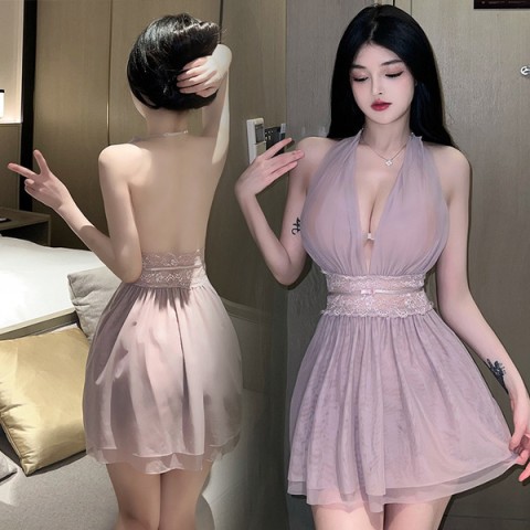 High-End French Mesh Lace Backless Suspender Nightgown